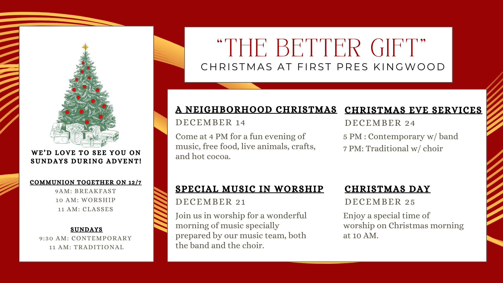 This Christmas season, we invite you to celebrate "The Better Gift" — the gift of Jesus Christ. Listed below, you will find special events that will be taking place at our church. Our prayer is that these events will help you deepen and sweeten your adoration of Jesus and help you keep Him at the center of your Christmas season. Come celebrate the birth of our Savior — "The Better Gift."