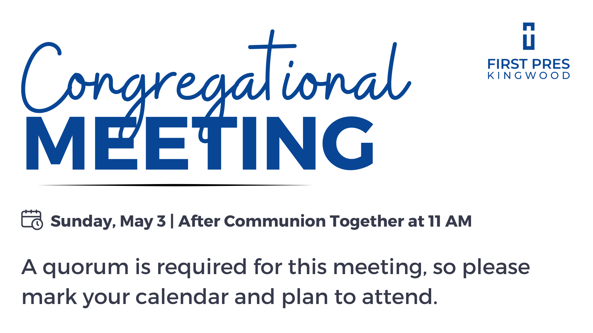 Please join us for our Congregational Meeting on Sunday, May 3. The meeting will take place in the Sanctuary right after the Communion Together service. A quorum is required for this meeting, so please mark your calendar and plan to attend.