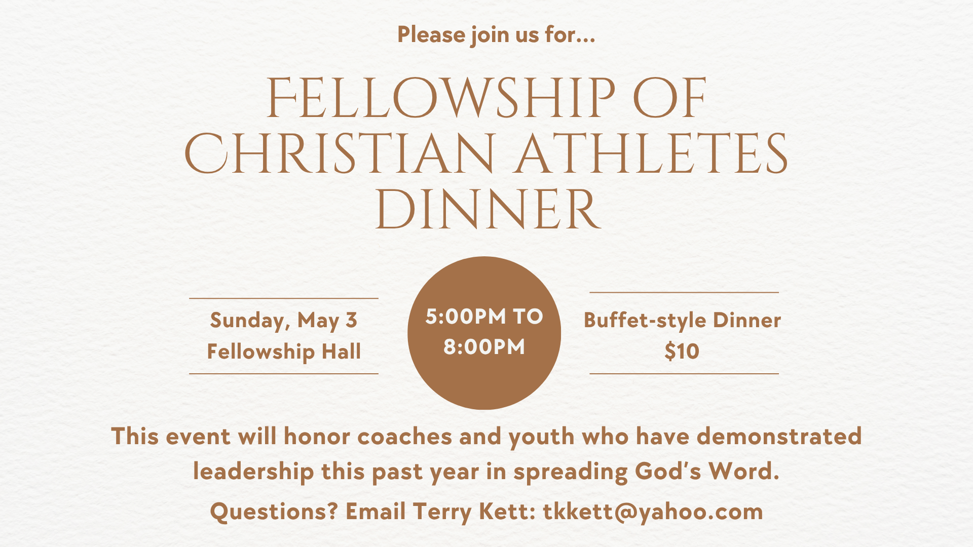 On May 3 from 5-8 PM, First Pres will host a special evening celebrating the impact of the Fellowship of Christian Athletes. This event will honor coaches and youth who have demonstrated leadership this past year in spreading God’s Word. Com and learn more about FCA, its ongoing ministry, and the work of First Pres Kingwood. Includes a buffet-style dinner in the Fellowship Hall. Tickets cost $10. Questions? Email Terry Kett: tkkett@yahoo.com.