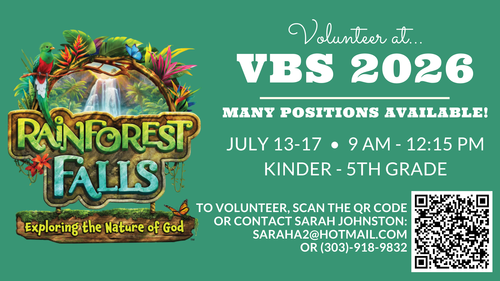 Come volunteer at VBS 2026! There are so many ways to serve… Choose when and where you serve based on your interests and what time works best for you. To register and see the full list of volunteer opportunities, scan the QR code, visit our website, or contact Sarah Johnston: saraha2@hotmail.com or at (303)-918-9832.