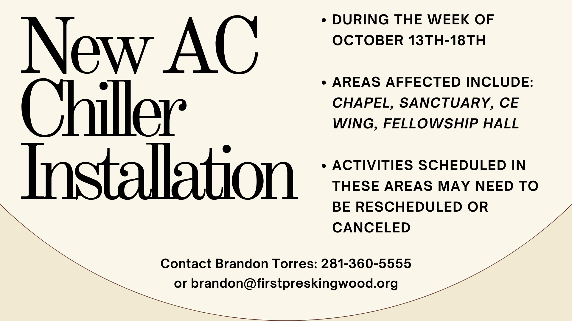 A new AC chiller will be installed during the week of October 13th-18th while CFS is out on fall break. Activities that are generally scheduled in areas that are controlled with air from the chiller (Chapel, Sanctuary, CE Wing, Fellowship Hall) will need to either meet off campus or contact Brandon Torres for rescheduling/cancellation: 281-360-5555 or brandon@firstpreskingwood.org. The Kingwood Drive entrance will also be closed during this time, please enter/exit through Trail River entrance.