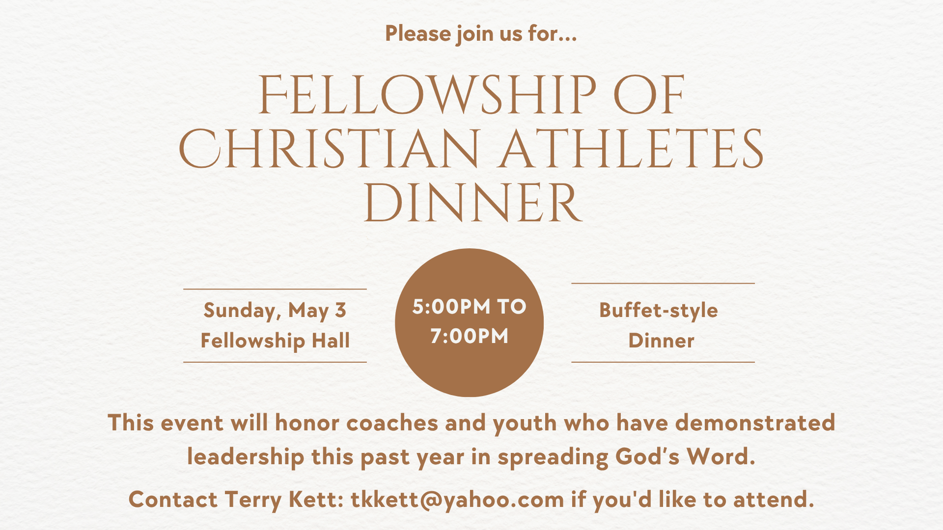 On May 3 from 5-7 PM, First Pres will host a special evening celebrating the impact of the Fellowship of Christian Athletes. This event will honor coaches and youth who have demonstrated leadership this past year in spreading God’s Word. Com and learn more about FCA, its ongoing ministry, and the work of First Pres Kingwood. Includes a buffet-style dinner in the Fellowship Hall. Contact Terry Kett: tkkett@yahoo.com if you'd like to attend.